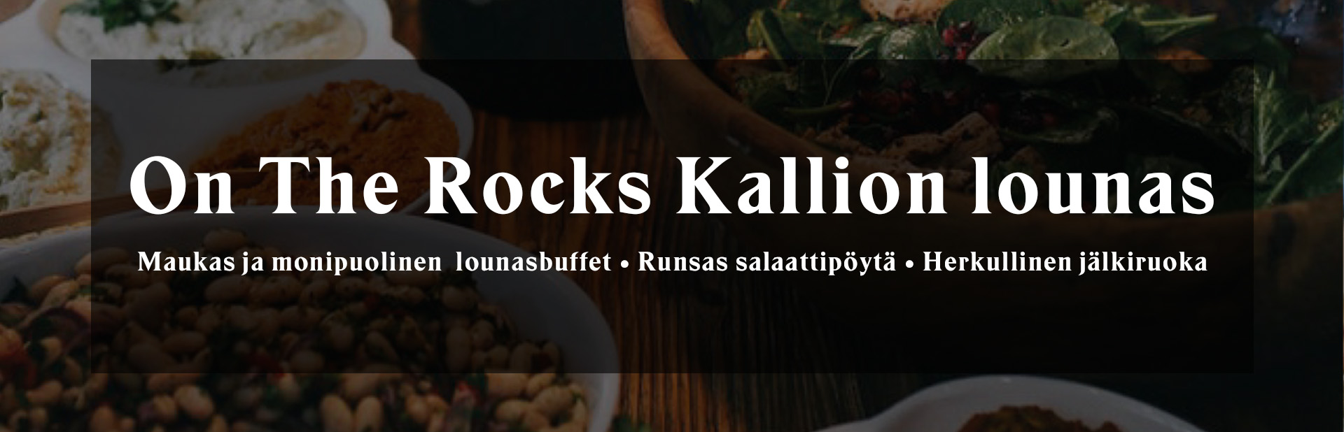 On the Rocks Kalliossa tarjoillaan arkisin buffetlounasta. Lounas sisältää kolme lämmintä ruokaa, runsaan ja monipuolisen salaattipöydän sekä kahvin/teen ja päivittäin vaihtuvan herkullisen jälkiruoan. Mikäli et löydä buffetpöydästä sinulle mieluisaa ruokaa, suosittelemme myös On The Rocks Kallion perinteisiä burgereita, jotka tarjoillaan lautasannoksina keittiöstä.